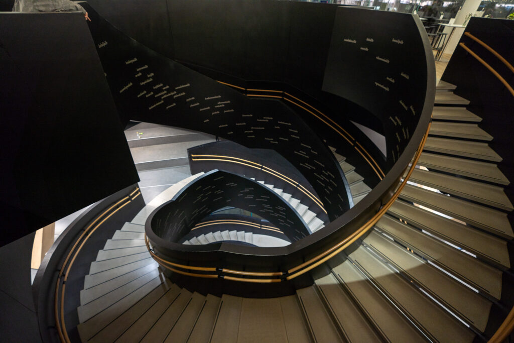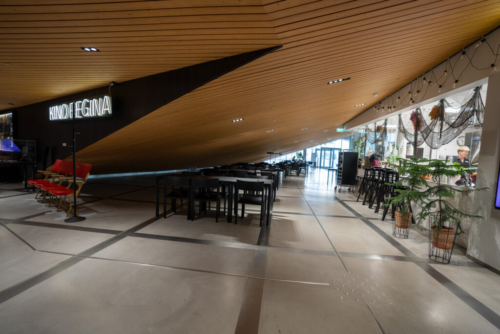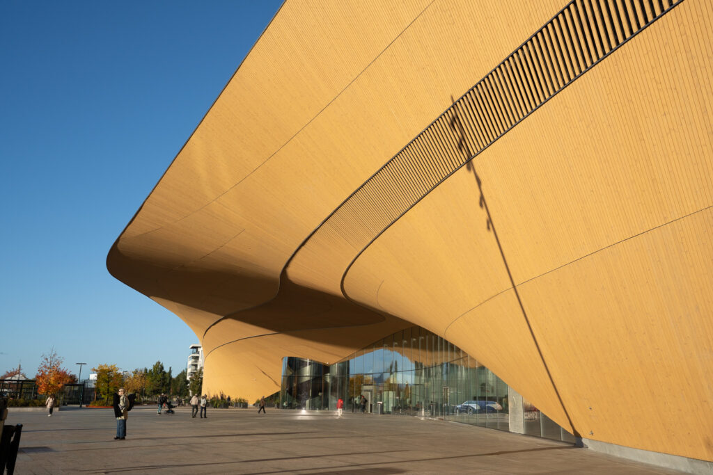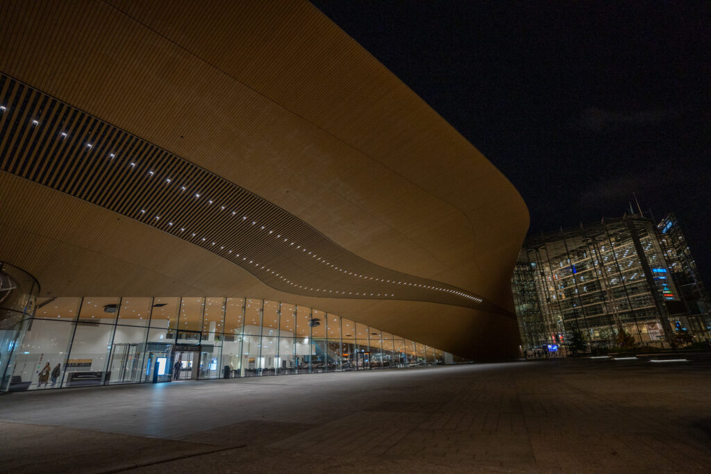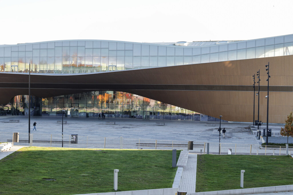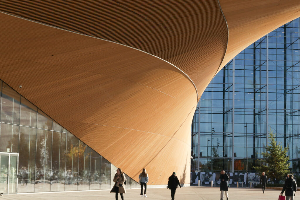 流線形の木造ファサードが特徴的な図書館。こちらは夜21時までオープン。コンセプトは「市民の交流のためのリビングルーム」図書館としての機能以外にも、ゲーム機や3Dプリンターの貸し出し、ワークショップスペースやカフェもあり、あらゆる使われ方がされていました。
