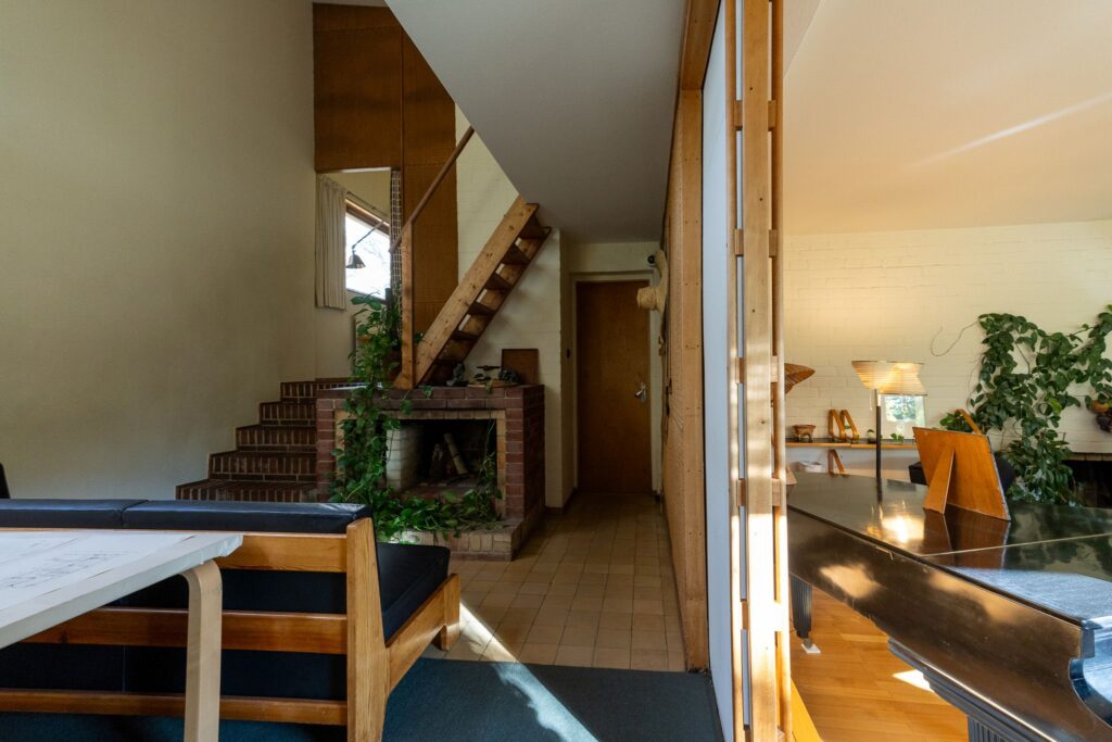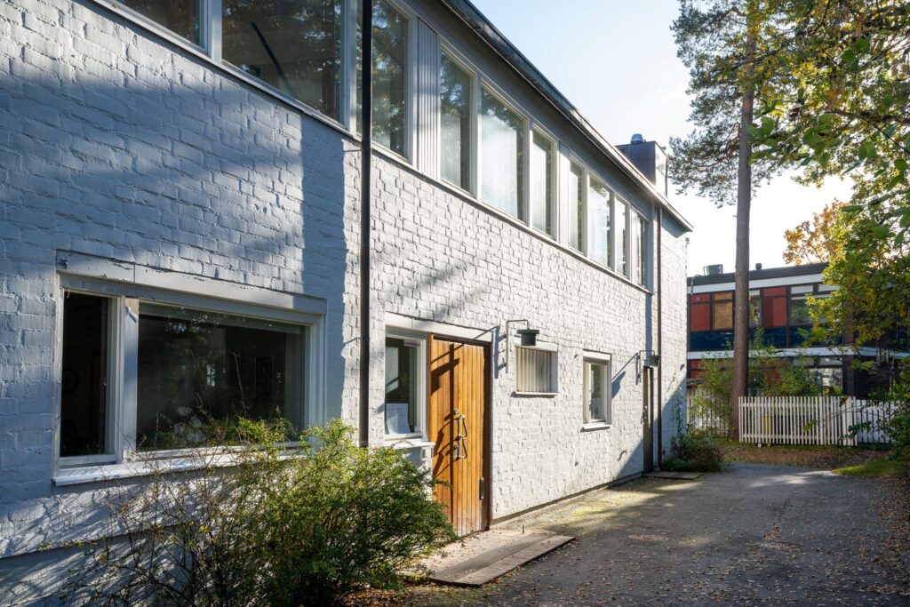 住宅街の中に佇むアアルトスタジオ。木製扉にアアルトデザインのドアハンドルが目印です。