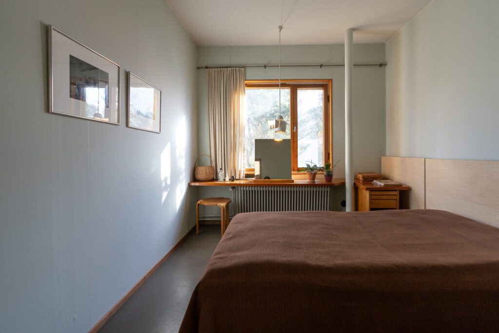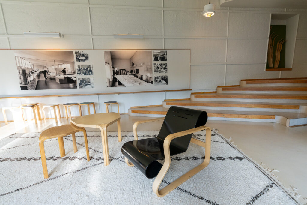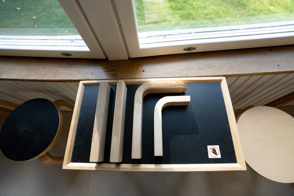 模型やマテリアルに直接触れ、椅子に座って体験できる貴重な場所。建築の「質感」を大切にするアアルトの思想が伝わってきます。