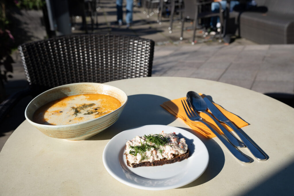 アアルト邸の見学を午前中、スタジオアアルトの見学を午後に設定していたので、徒歩でいける湖畔のカフェで、サーモンスープとトースト・スカーゲンを堪能。