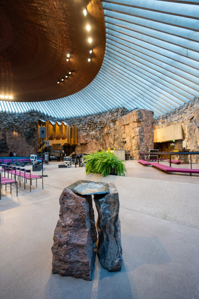 氷河期から残る天然の岩をくり抜いて造られた教会。銅板の天井が光を反射し、神秘的な雰囲気。