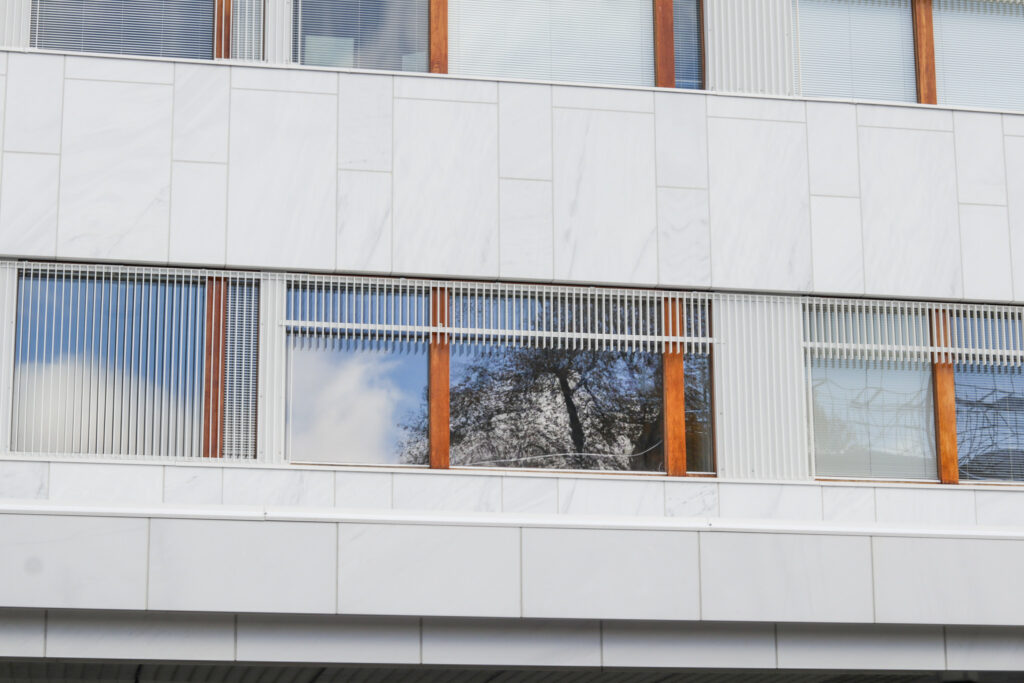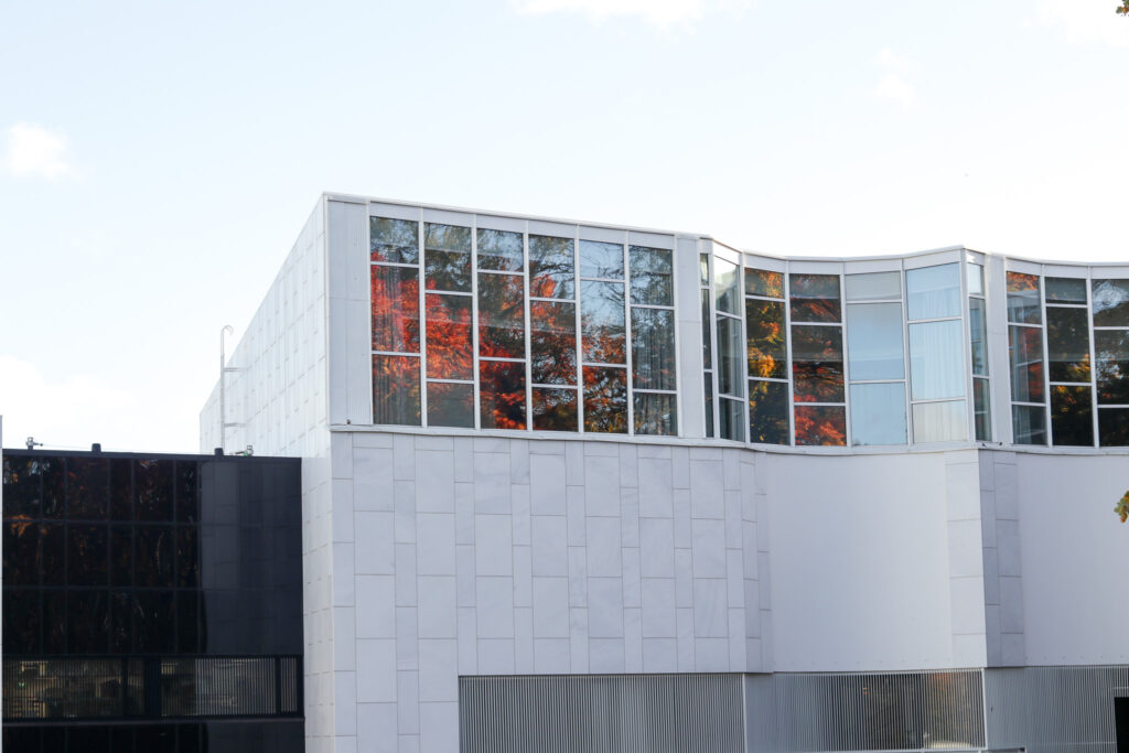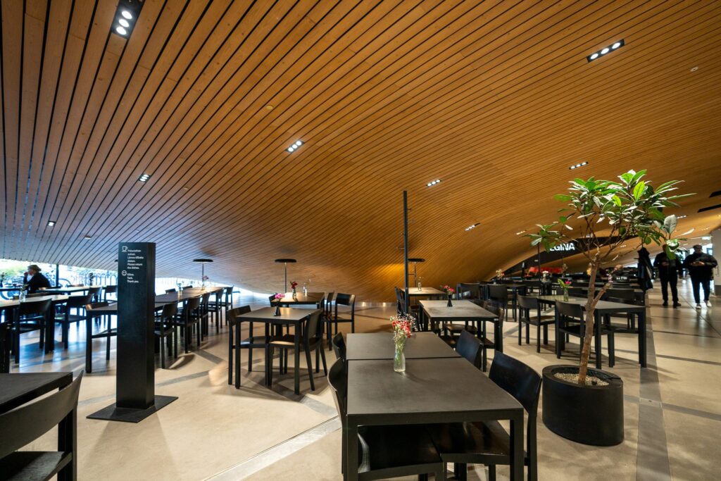 波打つような外観と自然光が、都市と自然の調和を感じさせます。