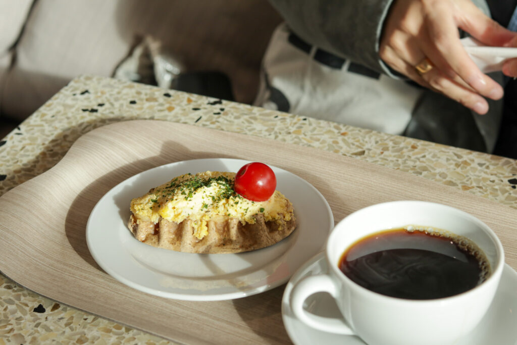 書店2階にあるカフェアアルトでモーニングをいただきました。2025年8月29日にはCAFE AALTO 新丸ビルがオープンしたばかりで話題ですが、建築好きとしては本店もおさえたいスポットです。