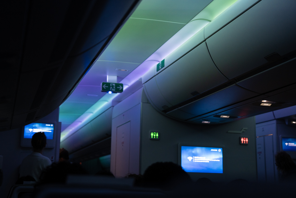 心躍る1回目の食事を終え、片付けが終わってほどなくすると、機内は徐々に暗くなり、機内の天井にオーロラが出現!