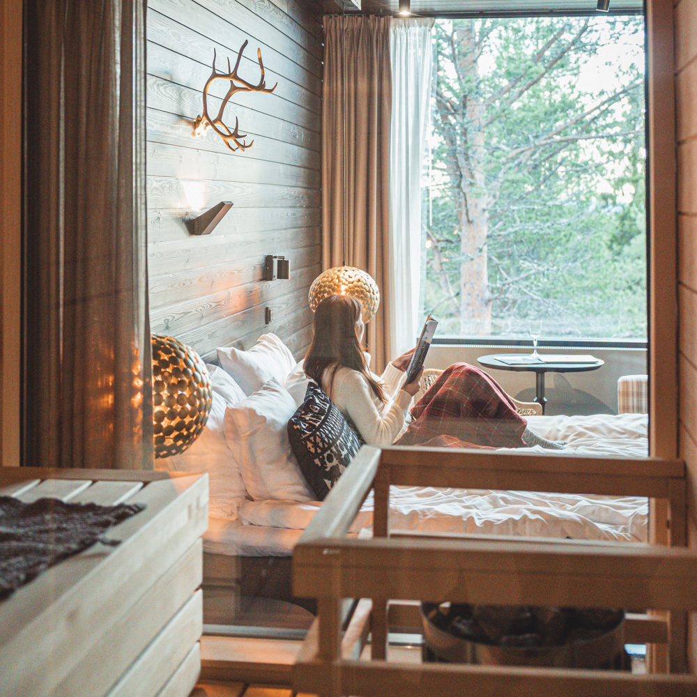 秋色に染まったラップランドの自然の中で過ごすため、街から少し離れた森の中のホテルに滞在しました。