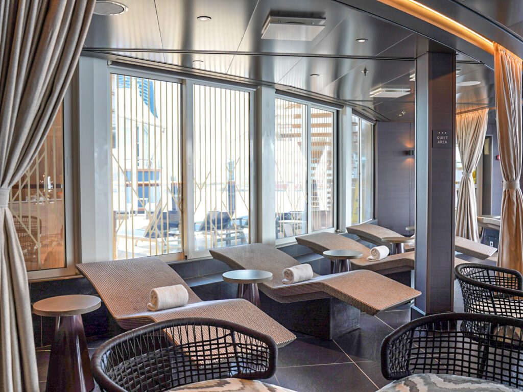 サーマルスイートパスを購入すると、落ち着いた海の景色が見られるヒーター内蔵のラウンジャー、ジャグジールーム、サウナ、スチームルーム、 ウォーターセラピーにアクセスできるそう。