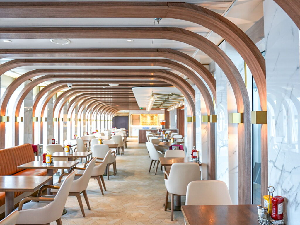 ステートルームの全てと、バーやラウンジ、メイン・ダイニング、各国料理レストランなどのデザインが一新されました。