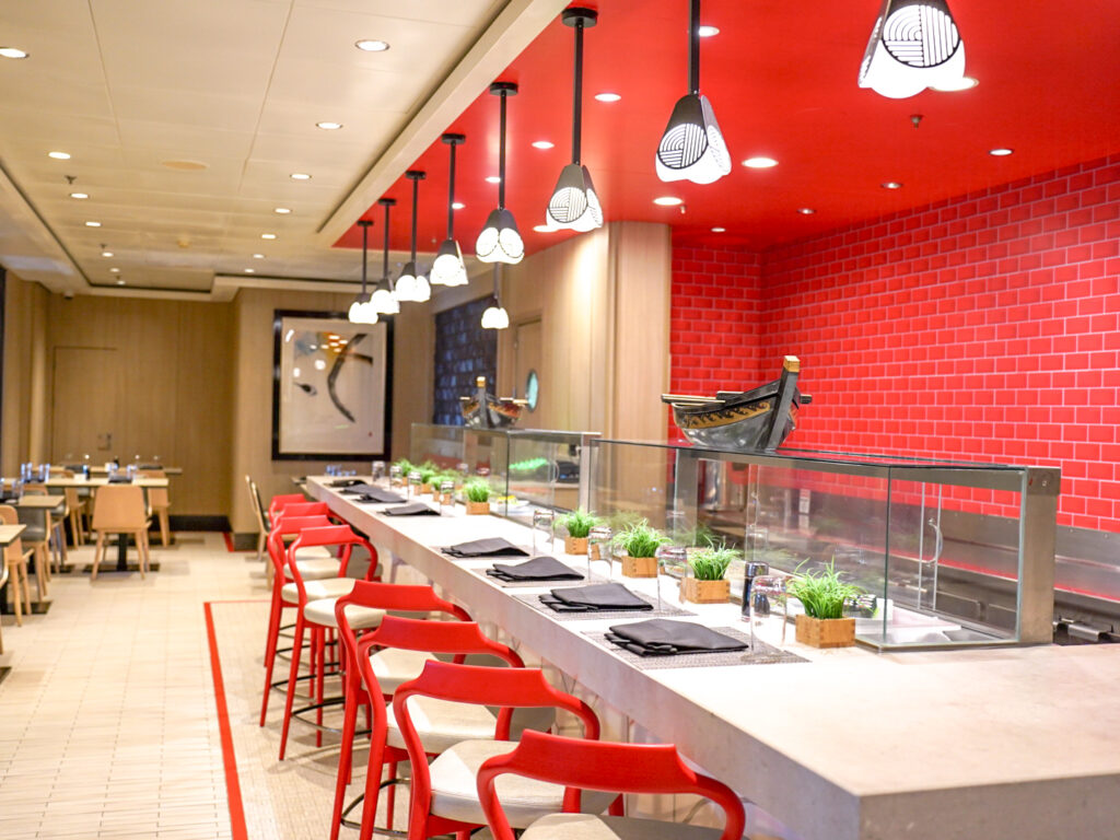 真っ赤な壁とチェアが斬新な「SUSHI BAR 寿司バー」