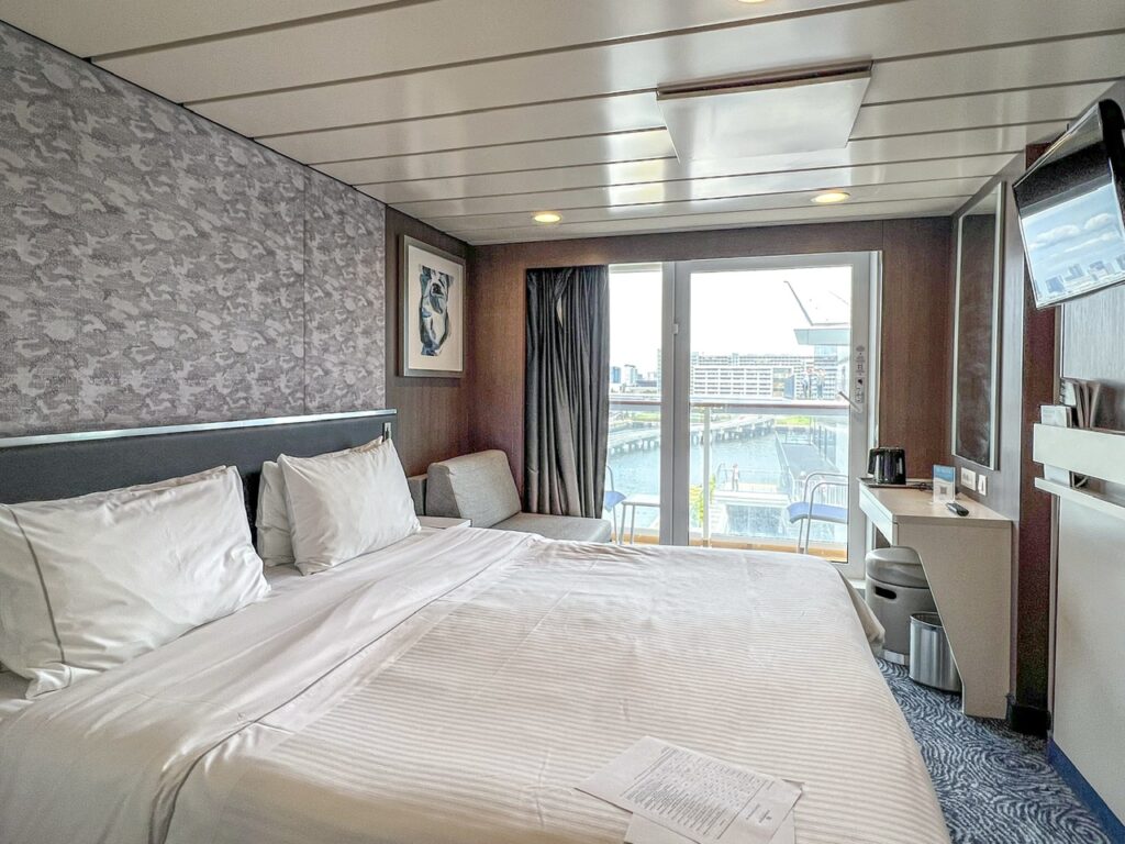 海側バルコミーのステートルームは、ベージュ・グレー・ブルーとコンパクトながら落ち着く空間。