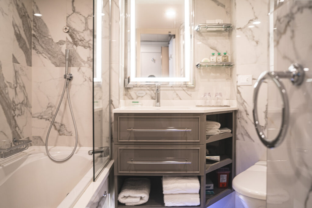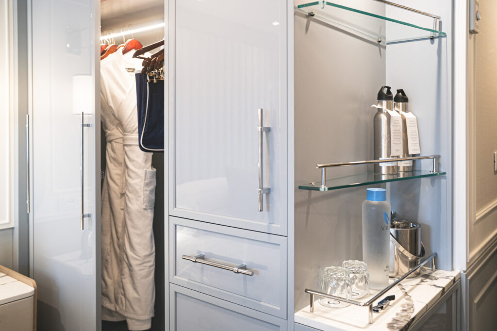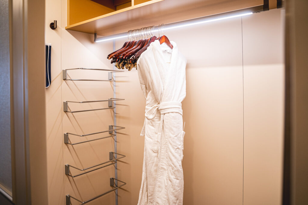 ただでさえクルーズ旅は洋服が多くなりがちですが、こんな素敵な船ならシチュエーションに合わせてとっておきのドレスを沢山用意したくなってしまうこと間違いなし。これだけの収納スペースがあれば安心です。