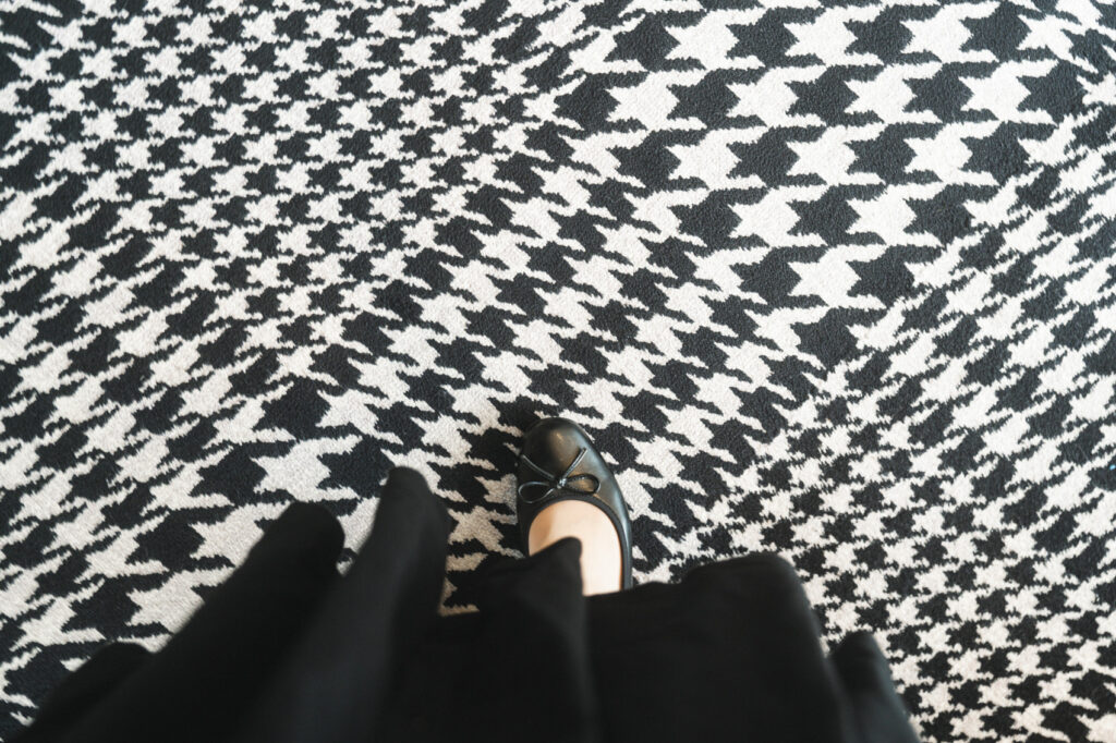 ヨーロッパ調のクラシックな調度品に、モダンなチェック模様の絨毯のスパイスが効いて、非常にフォトジェニック!