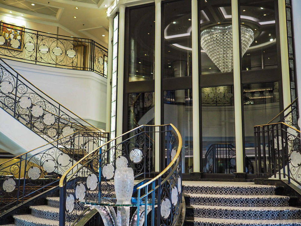 まるでタイタニック号を思わせるような豪華絢爛な中央ロビーの階段は、クルーズ中一度は写真を撮りたくなるであろうスポット。