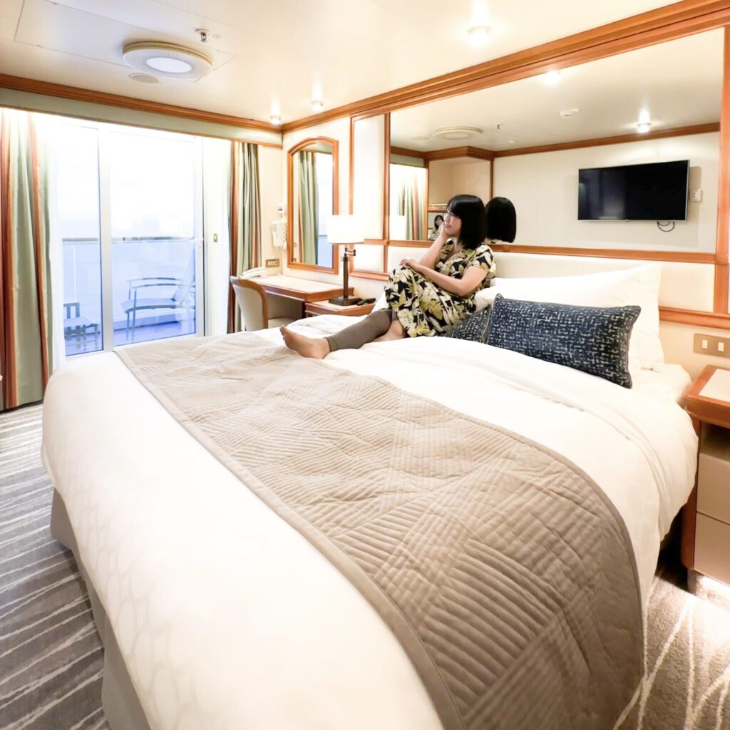 船内には全部で5タイプのお部屋がありますが、今回私が泊まったのは、海側バルコニーのお部屋で、約22〜29㎡。ベッドは、ダブルかツインに対応しています。