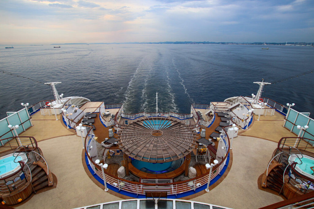 一番大好きなスポットが、船体後方にある、サン・デッキ 15 のスパプール(有料「泉の湯」エリア内)とアロハ・デッキ 12 のテラスプールがあるエリア。