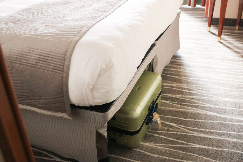 洗面所とシャワーブース前に開放的なクローゼットはあるものの、スーツケースはベッド下に収納しておくと便利。