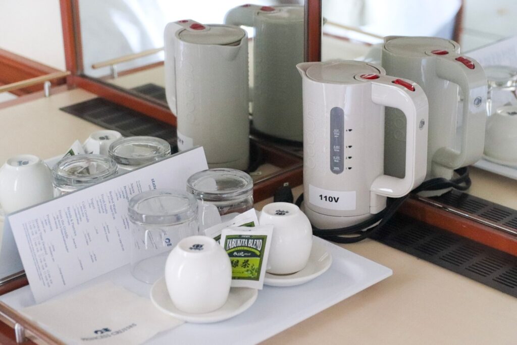 冷蔵庫、ケトル、ガラスのコップ、カップも備わっているので、客室で気軽にティーブレイクも出来ます。