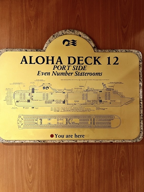 船内は迷子になるほど広いのですが、アプリや各デッキのエレベーターホールにあるオーシャン・コンパスで位置情報や目的地へのルートが確認できます。日本語表記があるのも嬉しいです。