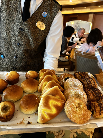 和洋にかかわらず焼き立てパンをサービスしてくれるのですがこのパンがまた美味しいんです。船内にはペストリー専門のシェフやスタッフがいて毎日焼きたてのパンが頂けます。
