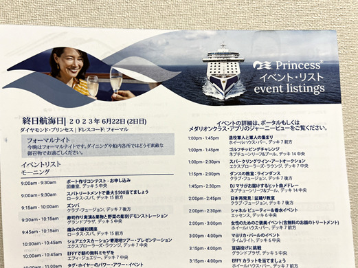 前夜にお部屋に翌日のイベントリストが置かれていて、これを見ながら次の日は何をしようか計画を立てるのも楽しいです。日本発着のクルーズだと日本語で書かれているのも嬉しかったです。