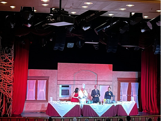 シアターの舞台でシェフが料理の実演をしてくれて、手元をスクリーンで映して調理の様子を見ることができます。その後に全員で厨房に入らせてもらえるんです!