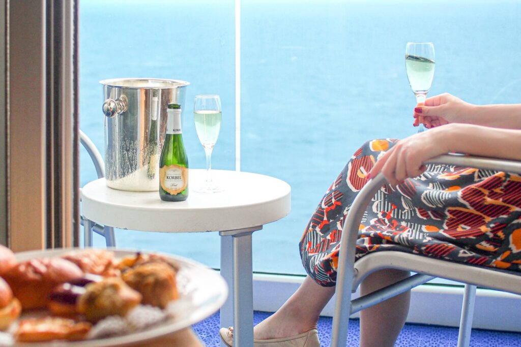バルコニーで海を眺めながらシャンパンを頂く。