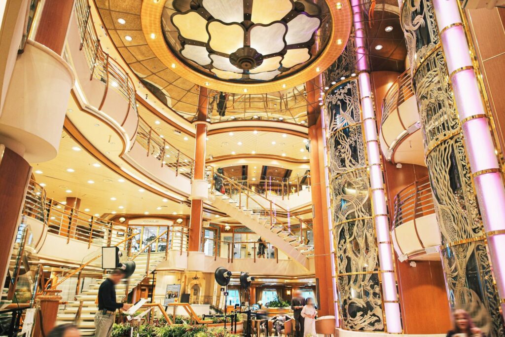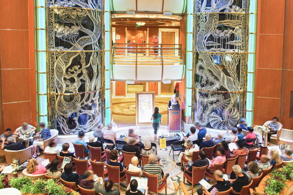 吹き抜けのアトリウムでは、乗客参加型のファッションショーや絵画のオークションが行われたり。
