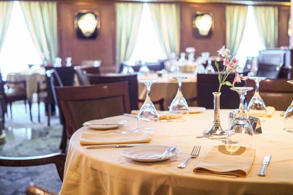 ダイヤモンド・プリンセスでは、メインダイニングでの夕食の席は指定制で毎回同じメンバーとテーブルを同じにし、毎日同じ係の人が給します。