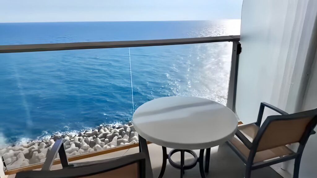 夜には、波の音を聞きながら星空を眺めたり、寄港地を出発する港の風景を見届けたりと、バルコニーだからこその贅沢な時間が楽しめました。