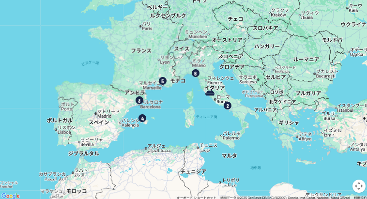 今回の航路は、チビタベッキア(ローマ)発着で、ナポリ、バルセロナ、マヨルカ島、ラ・スペツィア、そして終日航海日を含む王道のルートです。