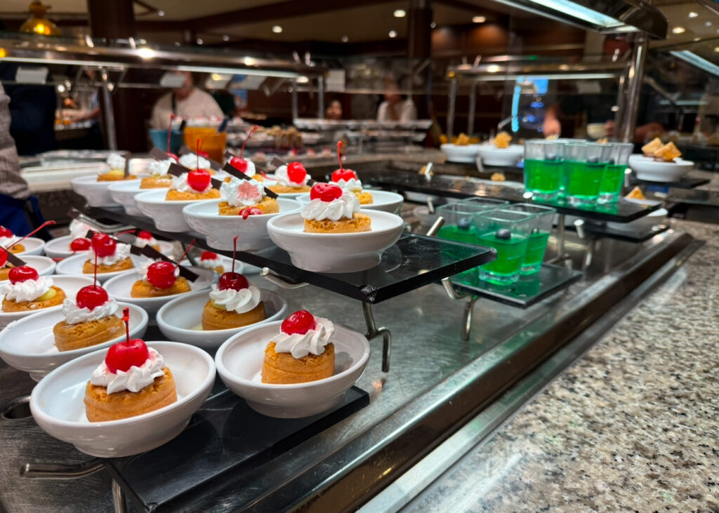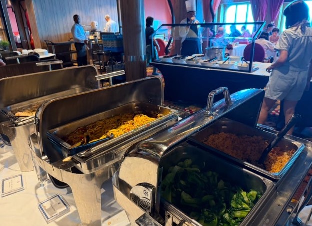 食事の楽しみも、大きな魅力の一つですね。船内には、無料で利用できるビュッフェレストラン、コース料理が楽しめるダイニング、気軽に立ち寄れるカフェが充実しており、どのお店の料理も美味しいです。