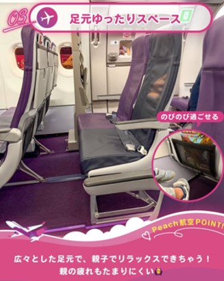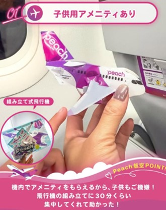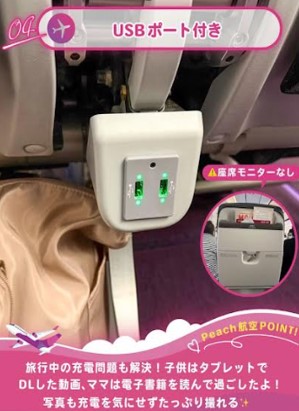 Peachのフライトは、未就学児でも安心な無料アメニティや豊富な種類の機内食など、子連れに嬉しいポイントが盛りだくさんでした。座席はUSBポート付きのためスマホやタブレットの充電も心配ありません。