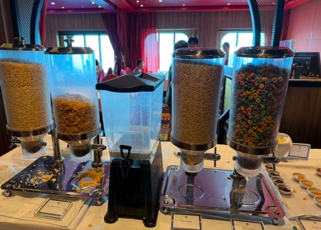 スタッフの方に飲み物を聞いていただけるのも子連れには有り難いサービスです。ビュッフェだと子供を見ながら飲み物や食事を取りに行くのが地味に大変ですが、テーブルサービスなら座って待っているだけ。今回のクルーズはファミリー層が多く、14階のビュッフェはいつも混んでいましたが、こちらは席取りに困ることもなく、朝からゆったりとした時間を過ごせました。