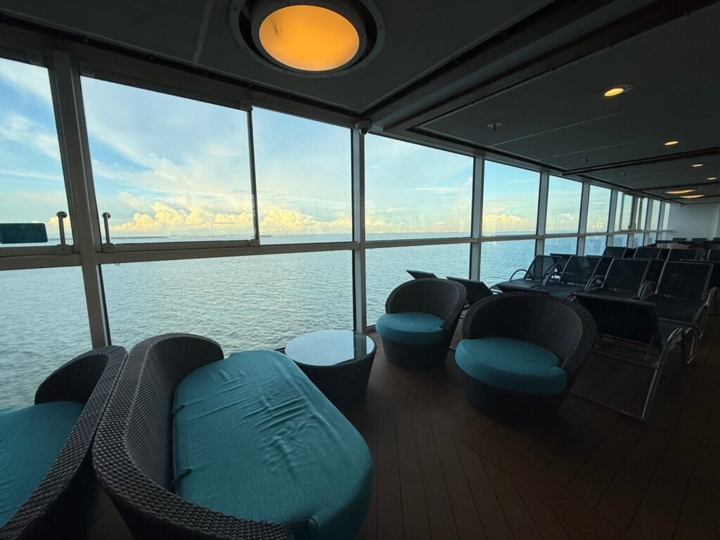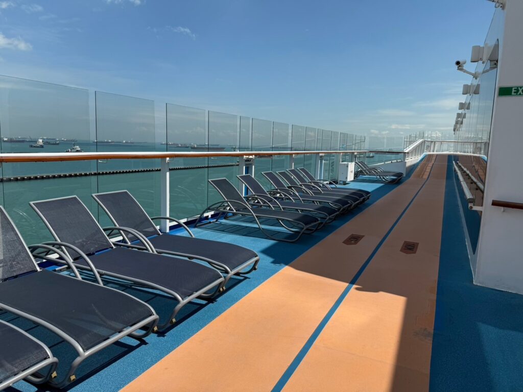 他に、デッキ15Fのスペースも素敵でした。高い場所なので美しい海や景色を眺められます。真っ直ぐながい道では、海の上のおさんぽしたり、ランニングしたり、チェアでのんびりしたりと思い思いに皆さん楽しんでいる様子です。