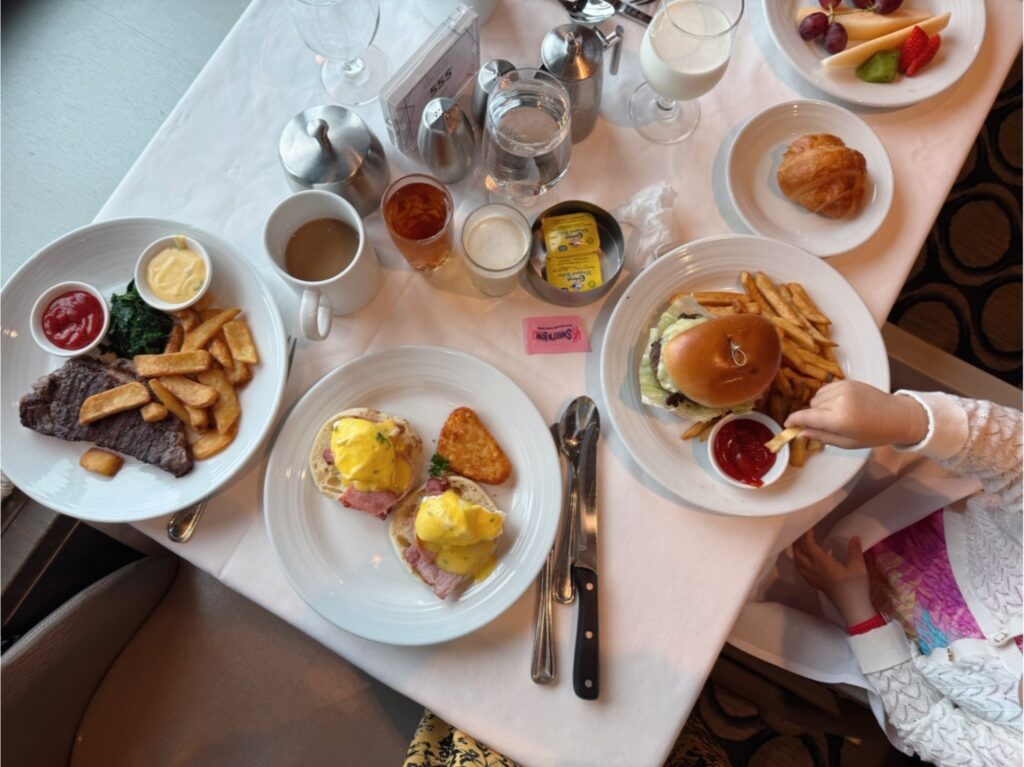 例えば、ある日のモーニングは「アメリカン・アイコン」というレストランへ。モーニングからコース料理を食べて優雅な気分に!値段を気にせず好きなものを自由にチョイスできるのも嬉しい。エッグベネディクトやステーキ、娘はハンバーガーとフルーツなどを注文。テーブルの上が華やかで楽しい気分に♡