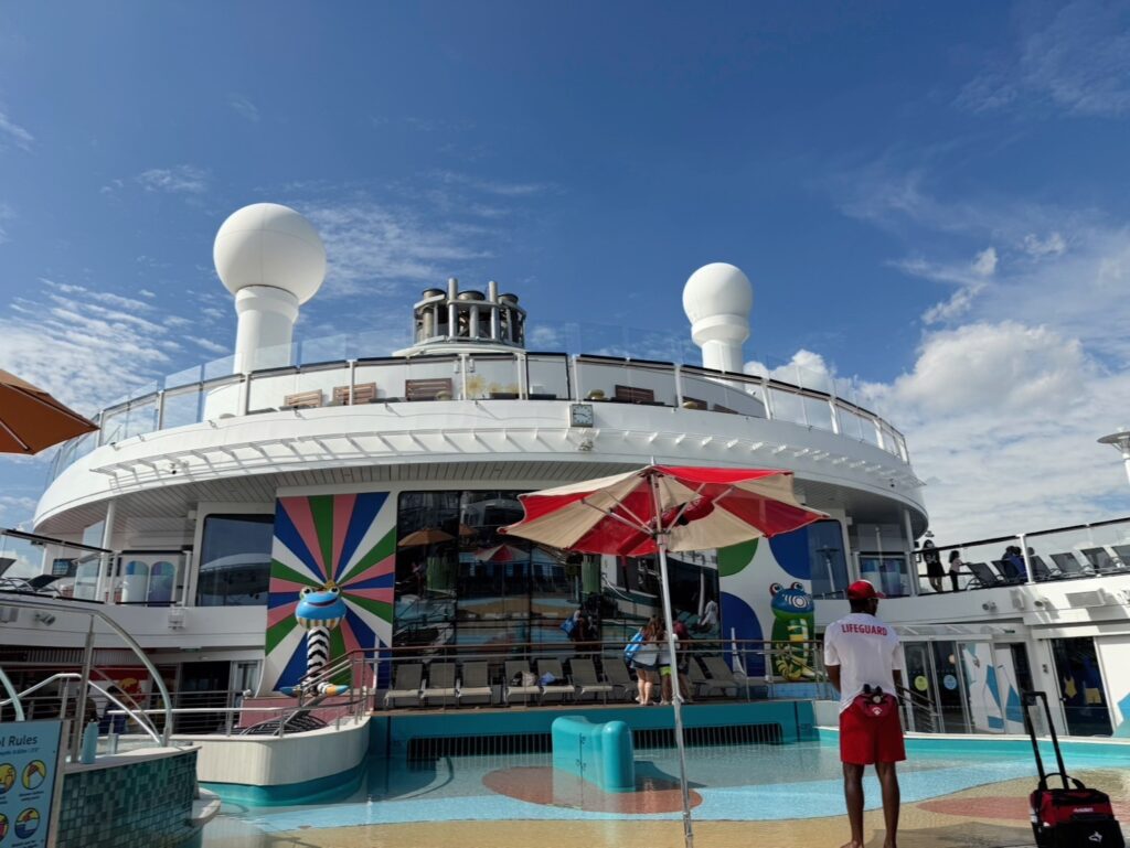 クルーズ船で、海の上でプールに入って遊びながら移動できるの、とっても魅力的。クルーズ船でも特に好きな時間の過ごし方です。