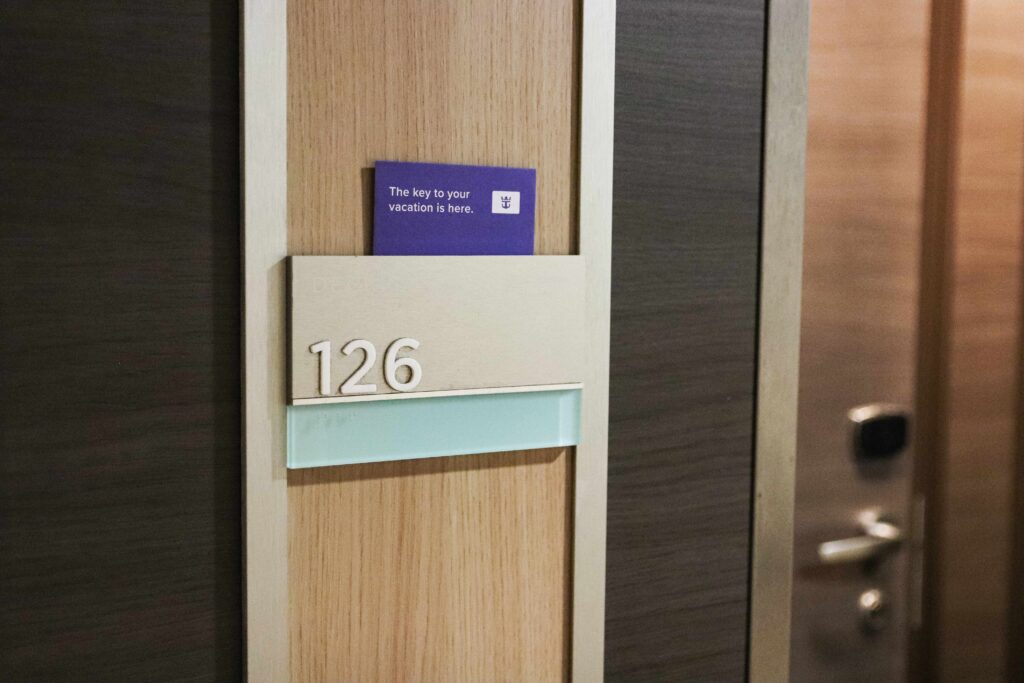 クルーズカード(SeaPass®)は、乗船手続きを終えたタイミングでは手渡されず、自分が泊まる客室外の部屋番号のところに挟んであります。(他の会社のクルーズ会社では、未だこのような仕組みを体験したことが無かったので、ちょっとした初体験で驚き!)