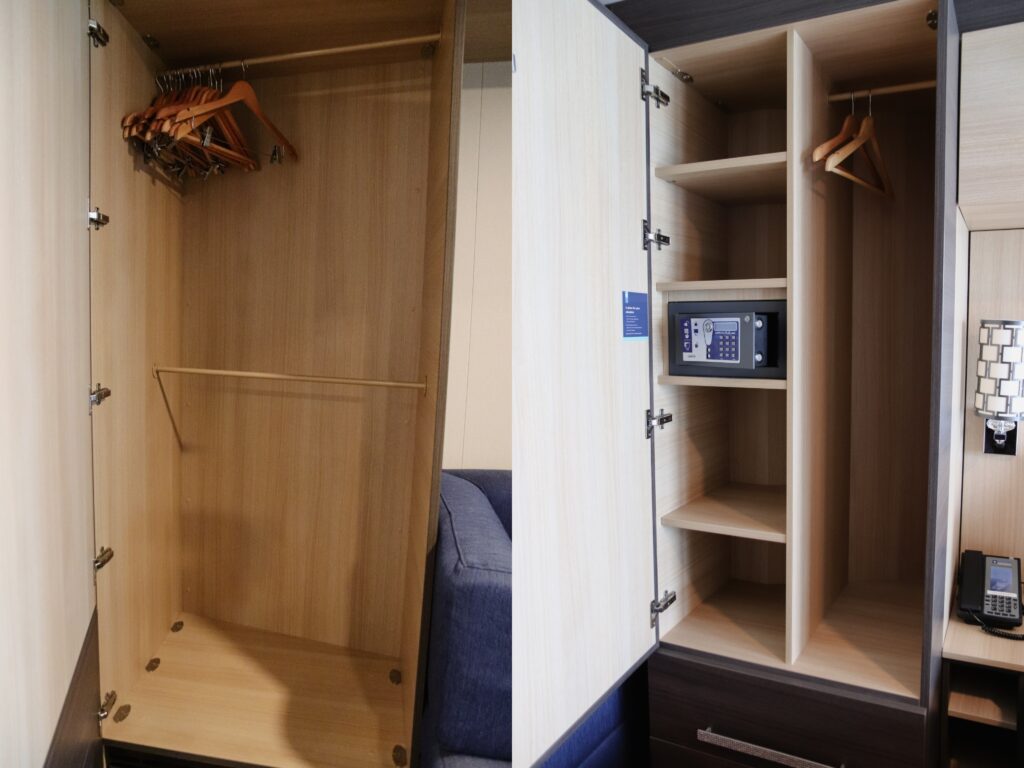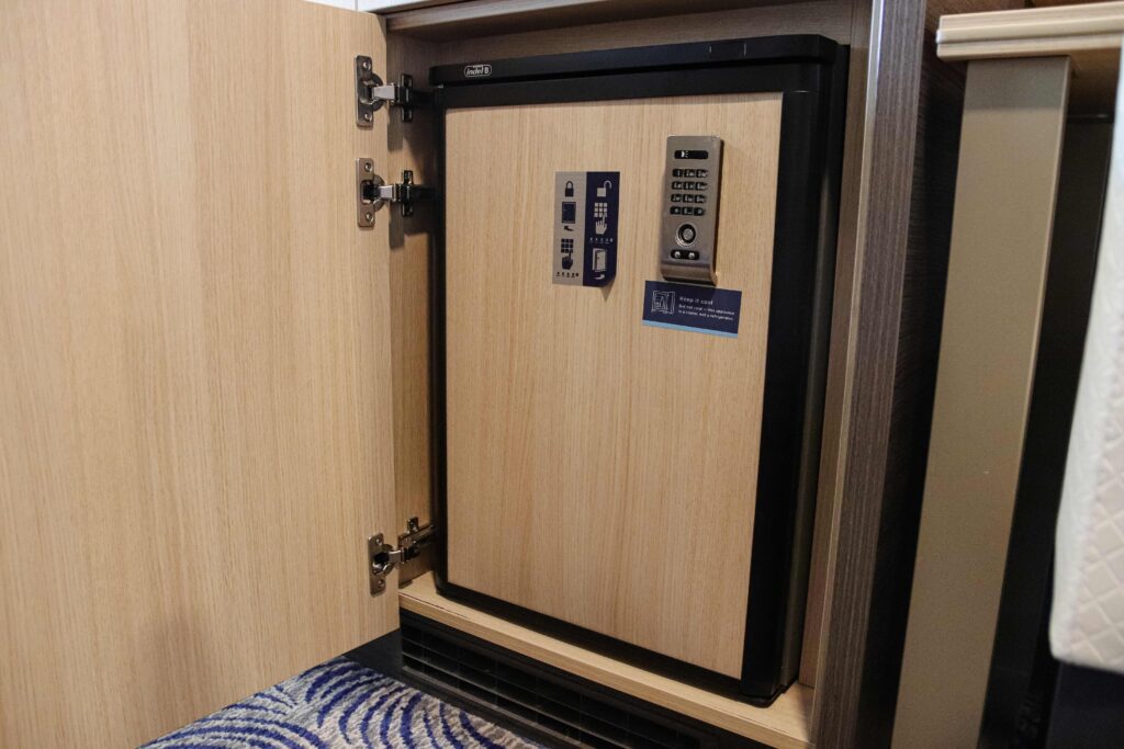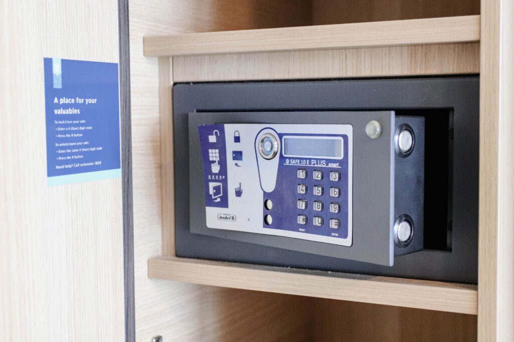 右側に4桁暗証番号式のセーフティボックスがあるので、大切な貴重品は預けるのがベター。