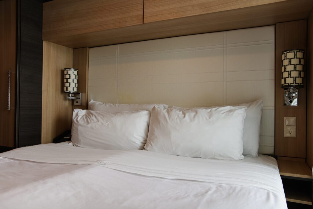 二人分のベッドを離して利用したい場合、乗船後でもルーム・スチュワードに頼めば対応して貰えます。ベッドサイドには、電源タップや電話もあります。