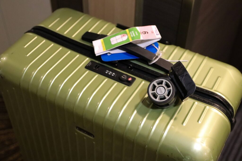 初日のシンガポール乗船手続き時に、港でポーターに預けたスーツケースの車輪がひとつ、壊れた状態で届きました。チェックインを済ませ、乗船してから客室でスーツケースを待っていたところ、特に伝言やメモはなく、スーツケースの上に車輪がコロンと置かれており(涙)