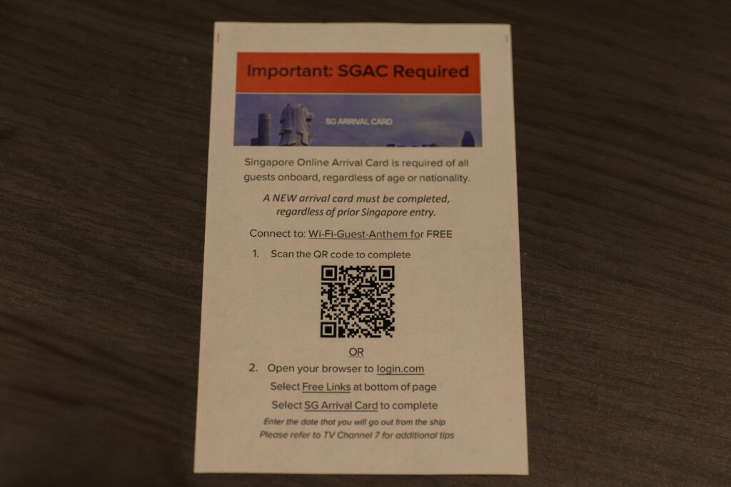 私が乗船した、シンガポール発着、マレーシア・ペナン島とタイ・プーケット島に寄港する、4泊5日のスケジュールでは、寄港(下船)に伴い登録する電子入国カードの手続きが必要でした。