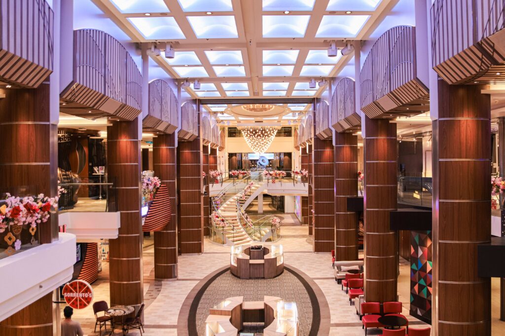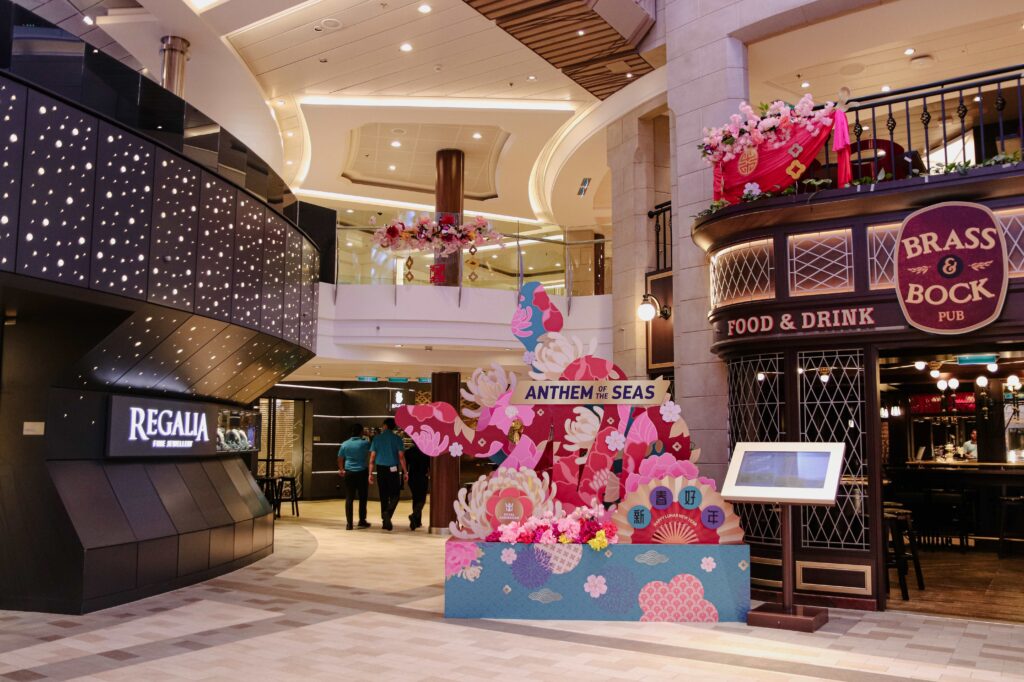 私が乗船したタイミングは、2025年の春節シーズンまっただ中。船の中央付近にある、2層吹き抜けの開放感あるエリア「ロイヤル・エスプラネード」をはじめ、ブッフェレストランなどにも、縁起の良い赤色の飾りがたくさんで、とても賑やかな雰囲気でした。