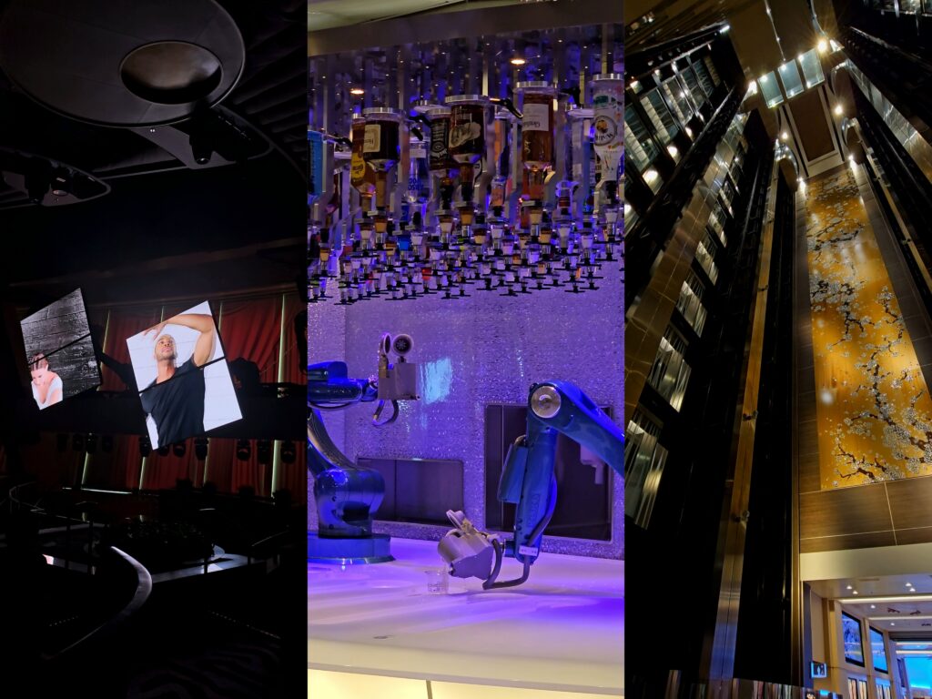 ▼左から、「トゥセブンティ」のショー、ロボットによる「バイオニックバー」、斬新な中央エレベーター