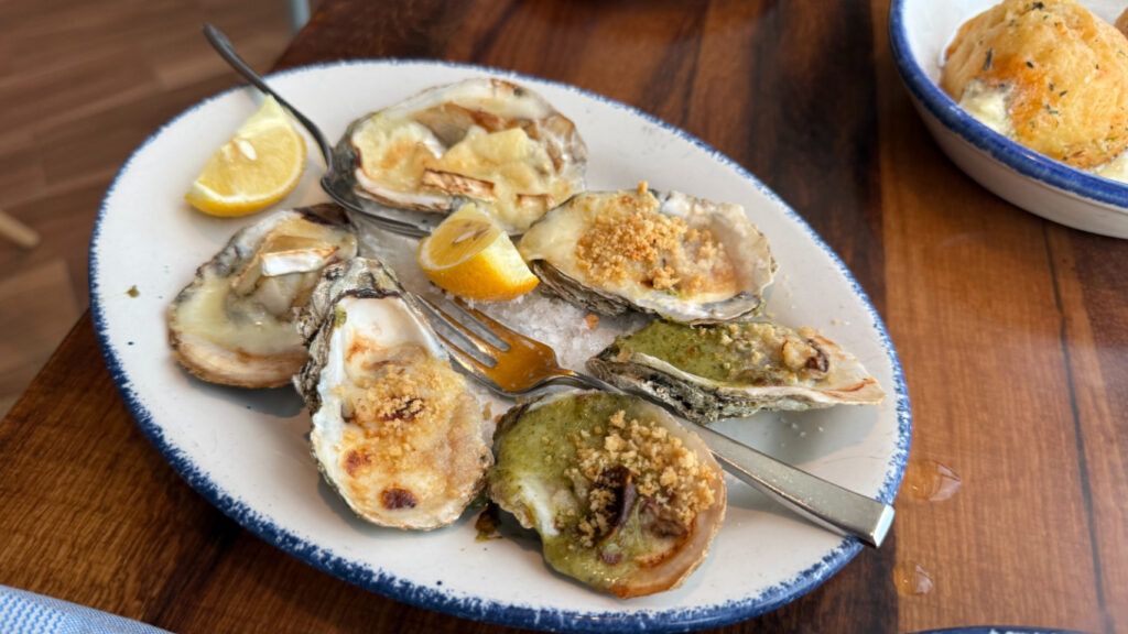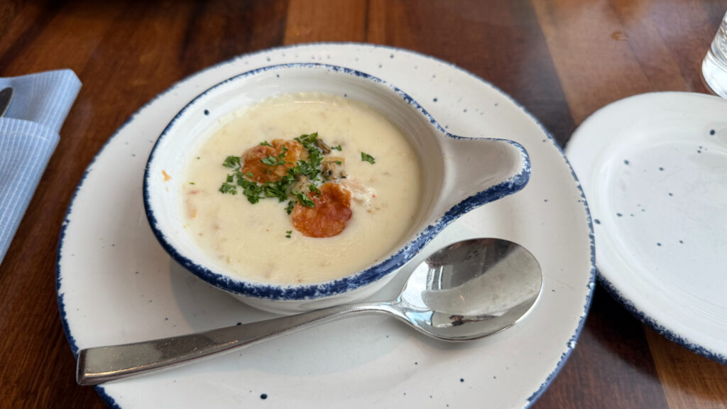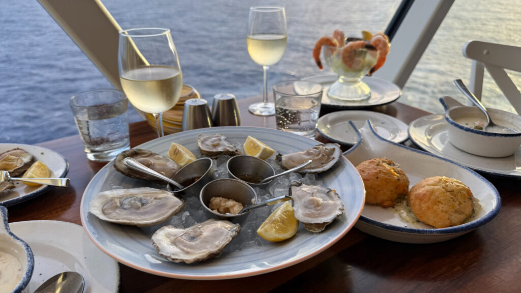 ここは有料レストランで、クラムチャウダー、新鮮なオイスターやシュリンプを白ワインと合わせ、贅沢な時間を楽しみました。