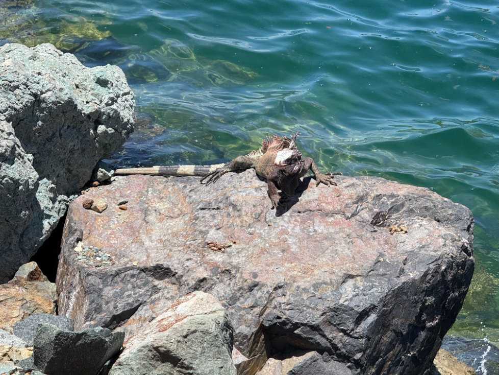 セントトーマスには野生のグリーンイグアナが多く、観光客の集まるエリアにも普通に現れて、日向ぼっこしていました。