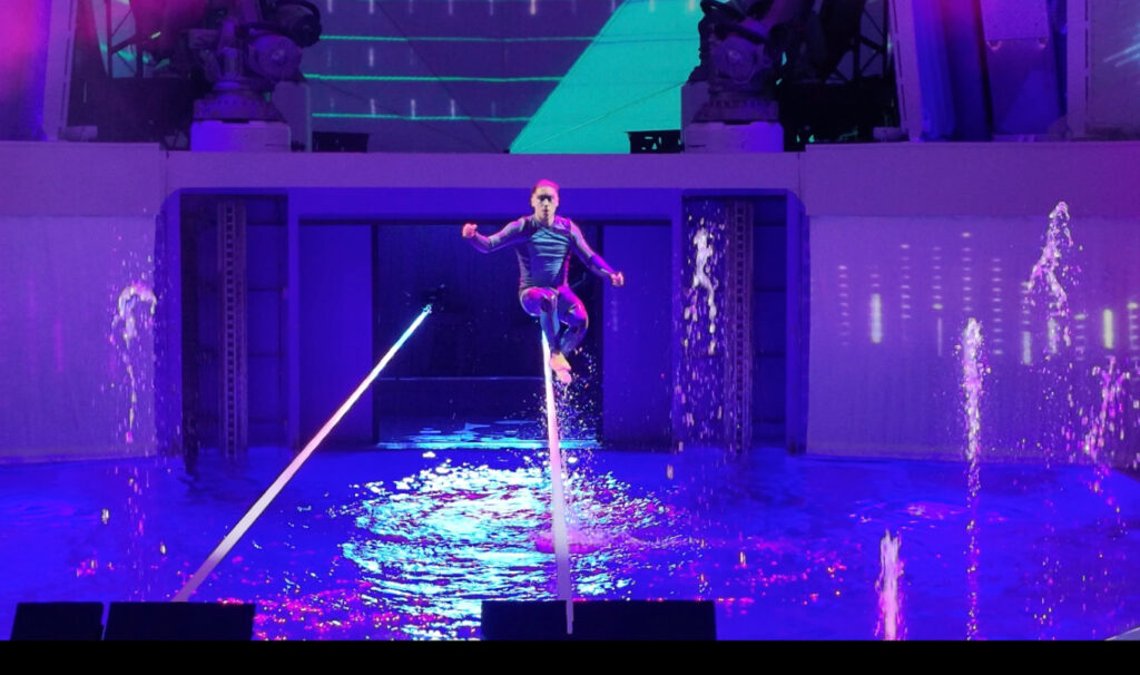 巨大な形を変える滝の下で繰り広げられるステージは、ダイナミックな演技が満載。