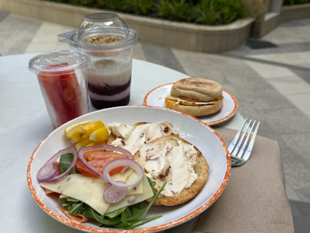 ベーグル以外にも、カットフルーツやヨーグルト、エッグマフィンなどもあるのでここでも飽きることなく楽しめて、こちらもコンプリメンタリー (無料) でした。