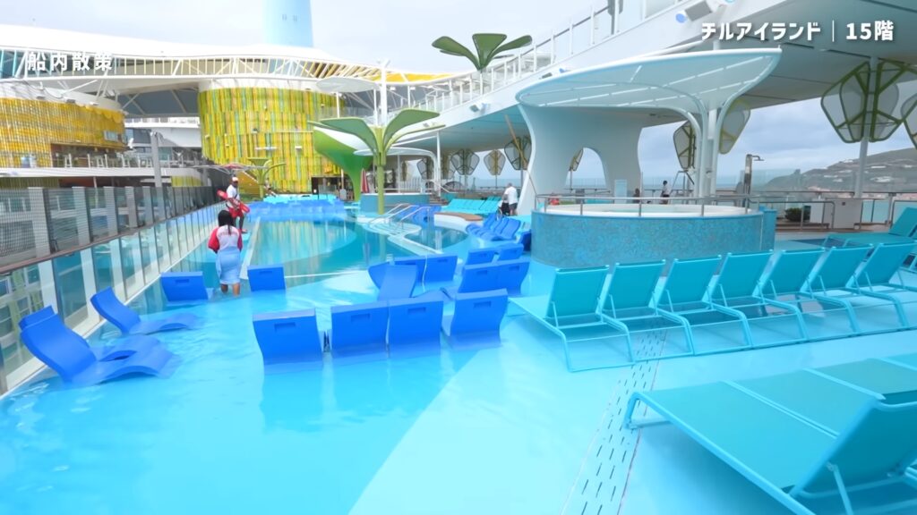船の上部には屋外プールとウォータースライダーがあります。天気の良い日はサンデッキでくつろぎながら海を眺めることができます。屋内プールもあるので、天候に関わらず楽しめます。船尾には海に浮かんでいるかのような景色が楽しめる大人専用のインフィニティプール「ザ・ハイドアウェイ」もあります。