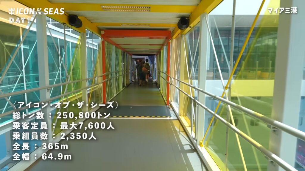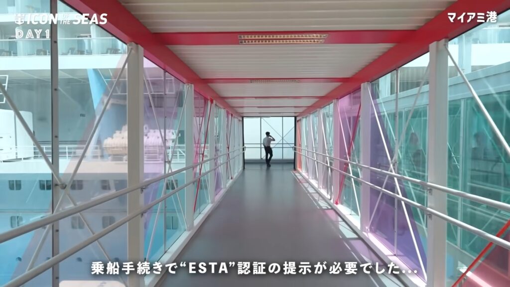 その後、チェックイン手続きとパスポートチェック、セキュリティチェックを経て船内へ。アメリカからの乗船の場合、ESTAの提示を求められることがあるため注意が必要です。出港は午後4時半ですが、客室ごとに乗船推奨時間が事前に通知されます。