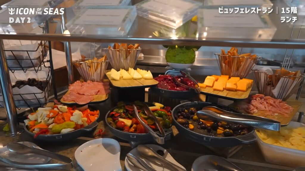 非常に広大で、洋食、アジア料理、グリルステーキ、パスタ、サラダ、デザートなど、食べきれないほどの豊富なラインナップが揃っています。日替わりで「カリビアン」などテーマに沿った料理コーナーも設けられます。