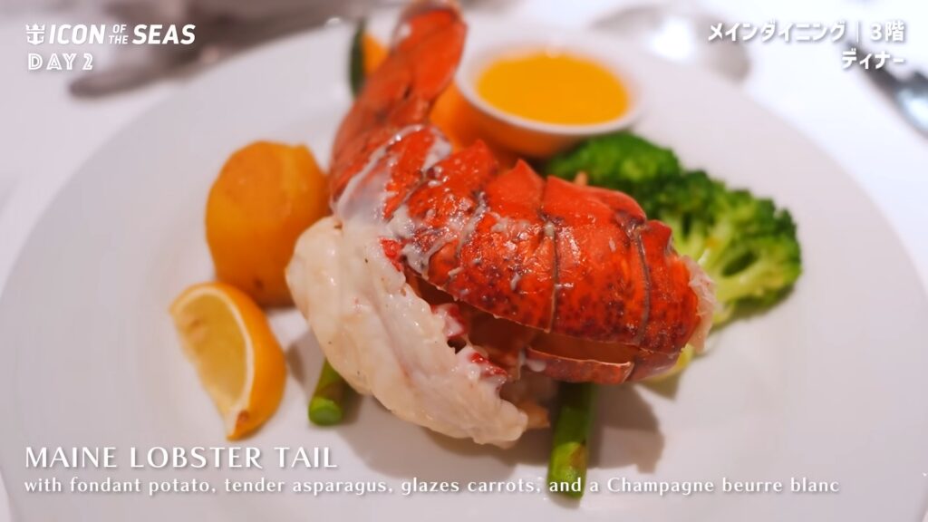 朝食、ブランチ、ランチ、ディナーで利用可能です。前菜、メイン、デザートから好きなものを好きなだけ注文できるコース料理形式です。メニューは毎日変わり、プライムリブやロブスターテイルなどの豪華な料理も無料で提供される日があります。
